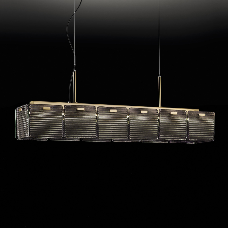 Light source: 1 x 48W | 3000k | 3100lm | 230V Materials: Metal, Glass Dimensions: W 1240 x D 200mm x H 450mm Pendant with metal finish avaliable in either light gold or chrome with a striped smoke or transparent glass diffuser. Designed by Stefano Traverso & made in Italy IP20 Dimmable |