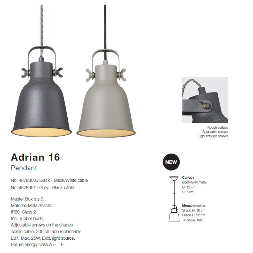 Product Code: 6N4878300x Light source: 25W (max) E27 Materials: Metal/Plastic Dimensions: H 220mm. 160mm diameter. Cord length 2000mm Brand: Nordlux The latest release from Nordlux sees their signature Scandinavian style meet contemporary minimal design in a classic way. Adrian offers an industrial spin on a favorable design. Designed in Denmark. Globe not included Available in black & grey IP20