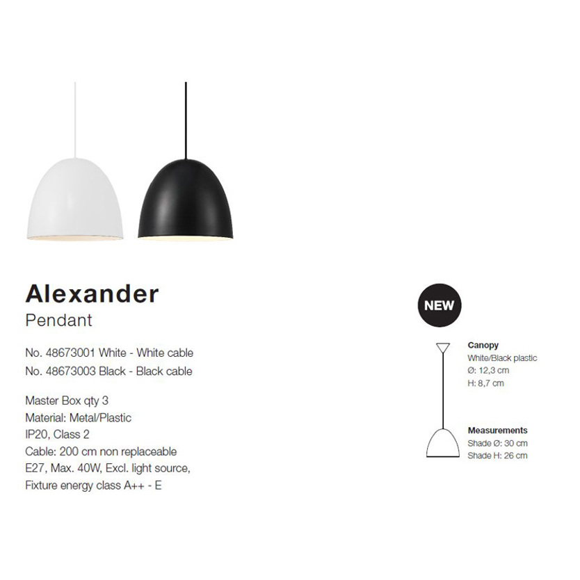 Product Code: 6N4867300x Light source: 1 x 40W | E27 | 240V Materials: Metal Dimensions: Ø 300mm x H 260mm Alexander is a modern lamp in a timeless design. The shiny metal details combined with the silky matte surface make the lamp highly decorative and along with the round metal screen, which provides a great downward light, design and functionality are balanced in the most wonderful of ways. Available in a black or white finish. IP20 Designed in Denmark For trade enquiries, please contact us below. |