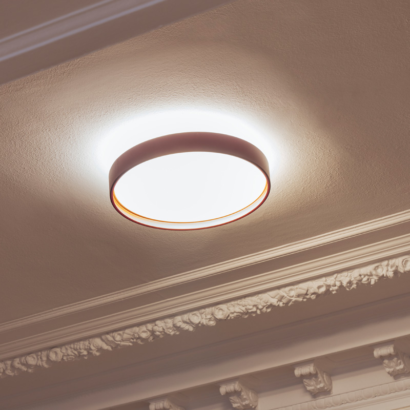 Product Code: 8M6669 Light source: 2 x 12W E27 LED | 2700k | 1100lm (x2) Materials: Stainless steel, PMMA Dimensions: Ø 370mm x H 113mm A ceiling light in two sizes, 370 and 500 mm, with a ceiling fixture base in translucent polymethyl-methacrylate (PMMA) with satin-finish on both sides. Decorative ring in stainless steel and textured white, charcoal grey or burgundy lacquer. Diffusing shade in polymethyl-methacrylate (PMMA), thermoformed with black sides for the stainless steel model and gold lacquer for the other finishes. Price varies between finishes. Designed by Jordi Jané & Made in Spain Dimmable
