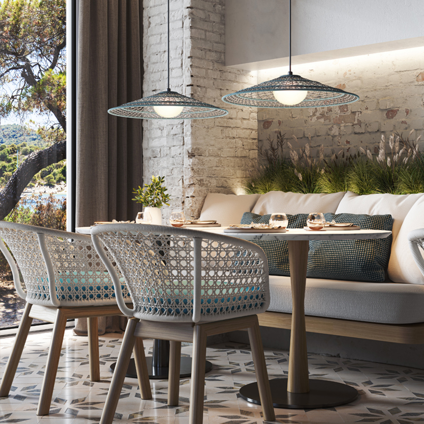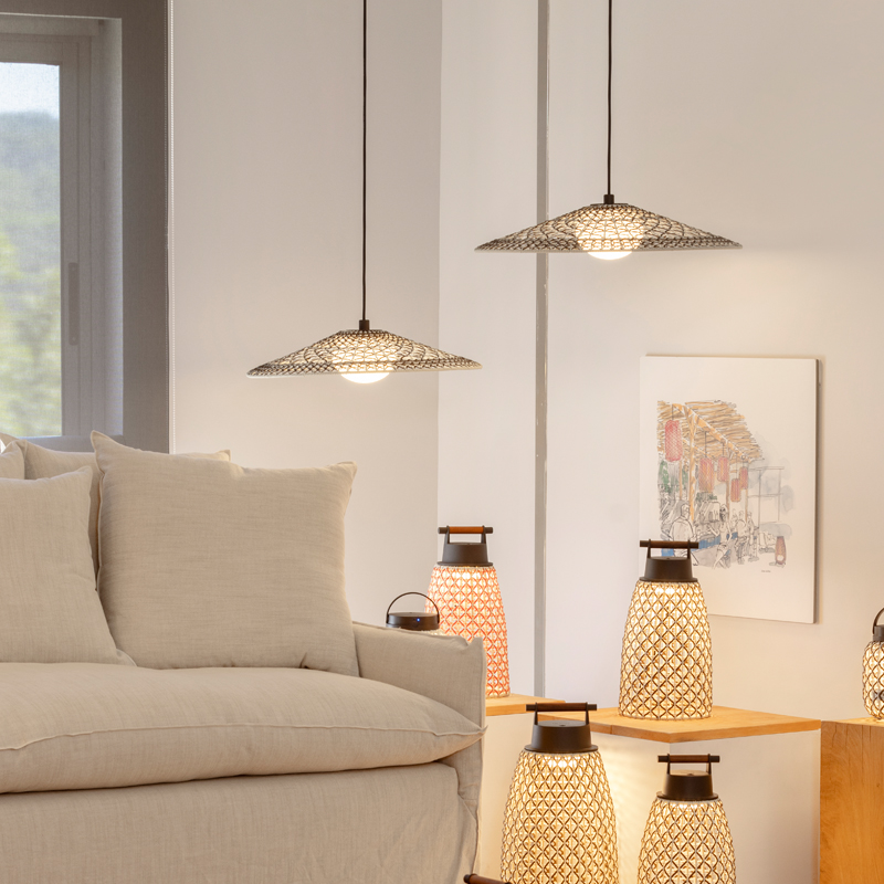 Product Code: 6B30930214171 Light source: 8W LED (Built-In) | 2700K | 635lm Materials: Aluminum, Synthetic Fiber, Polyethylene Dimensions: H 120mm x W 550mm | 1800mm Cable Suspension Brand: Bover The Nans 55 shade is hand woven with a more elaborate weave compared to others in the collection, combining different ways of weaving the fibre in the same layer. It also incorporates an elliptical polyethylene diffuser, which filters the light and prevents glare for a pleasant lighting experience. Rated IP54 suitable for outdoor use. Dimmable with TRIAC, other dimming on request. Designed by founder and director Joana Bover and made in Spain/Indonesia. For trade enquiries, please contact us below. RELATED ITEMS