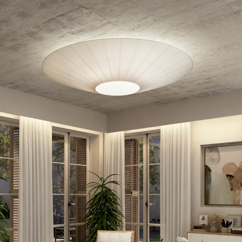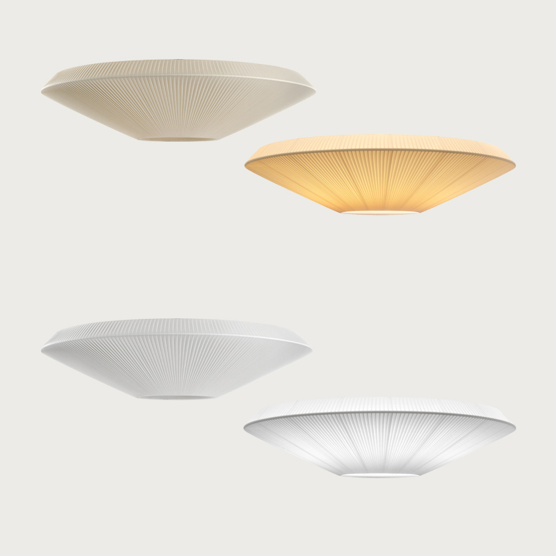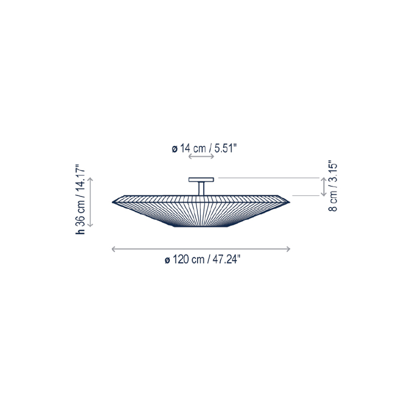 Product Code: 6B0232013P/P698C Light source: 6 x 15W LED E27 (Max) | Not Incl. Materials: Ribbon, Iron, Stainless Steel, Methacrylate Dimensions: Ø 1200mm x H 360mm | Base Ø 140mm Brand: Bover SIAM breaths a certain oriental air derived from the inverted shade. Featuring anti-dust and easy to clean semi-translucent ribbon, this dramatic and over-sized ceiling light provides ample light while serving as a soft, textural focal point. Available in White or Cream with White structure and opal acrylic diffuser. Also available in other sizes and with different height fixings, to create cluster compositions (price varies). Dimmable with dimmable globes. Designed by Joana Bover and made in Barcelona. For trade enquiries, please contact us below. RELATED ITEMS