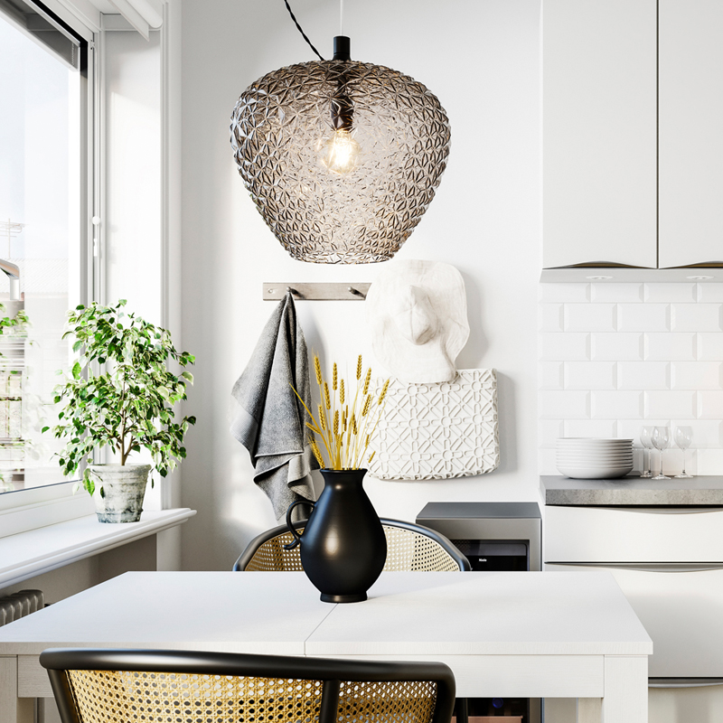 Product Code: 4B4201150-5503 Light source: 1 x E27 60W (max) Materials: Glass Dimensions: Ø 290mm x H 250mm | 1200mm suspension cord BRAND: By Rydens Patterned glass pendant light available in Smoke Grey. Indoor only. Designed in Sweden.