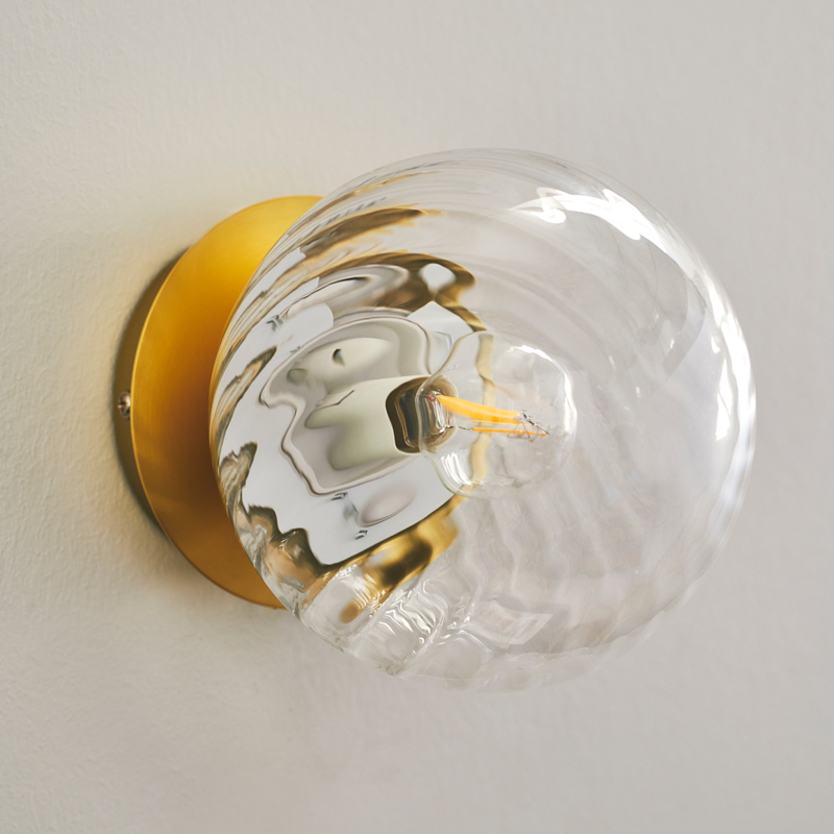 Product Code: 6N2312111035 Light source: 1 x E14 25W (max) | Not Incl. Materials: Metal, Glass Dimensions: Ø 150mm x D 180mm | Base Ø 100mm Brand: Nordlux Chisell draws inspiration from the glamourous Art Deco style and features modern brass and swirled glass. The swirled glass dome creates a beautiful light effect on the wall and is mouth-blown, giving each glass its own unique character. Rated IP20 suitable for indoor use. Dimmable with compatible globes. Designed by Nordlux Denmark. For trade enquiries, please contact us below. RELATED ITEMS