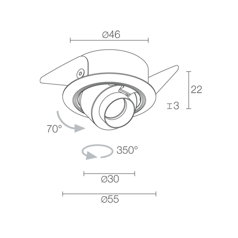 Product Code: 4LCK160015MB Light source: 1 x 2.5W | 3000k | 144lm | CRI 90 | 24V Materials: Body and recessing frame in aluminium Dimensions: Ø 39mm x D 32.5mm (depth of fitting only) Recessed light for indoor ceiling applications. Body and frame finished in either anodized matt black or body and frame painted white. Beam options available are 17˚, 29˚, sharp 48˚, 52˚ and 16˚ x 34˚. Power supply 24V IP40 Designed and made in Italy