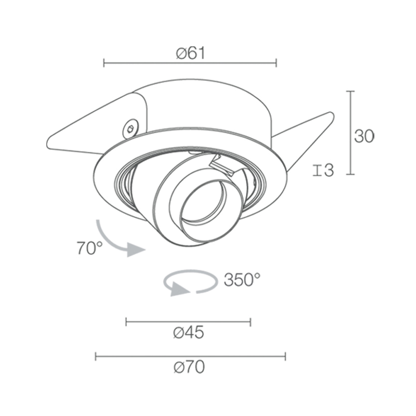 Product Code: 4LCK260015LB Light source: 1 x 2.5W | 3000k | 144lm | CRI 90 | 24V Materials: Body and recessing frame in aluminium Dimensions: Ø 39mm x D 32.5mm (depth of fitting only) Recessed light for indoor ceiling applications. Body and frame finished in either anodized matt black or body and frame painted white. Beam options available are 11˚, 17˚, sharp 19˚, 32˚, 65˚ and 13˚ x 43˚. Power supply 24V IP40 Designed and made in Italy For trade enquiries, please contact us below. |