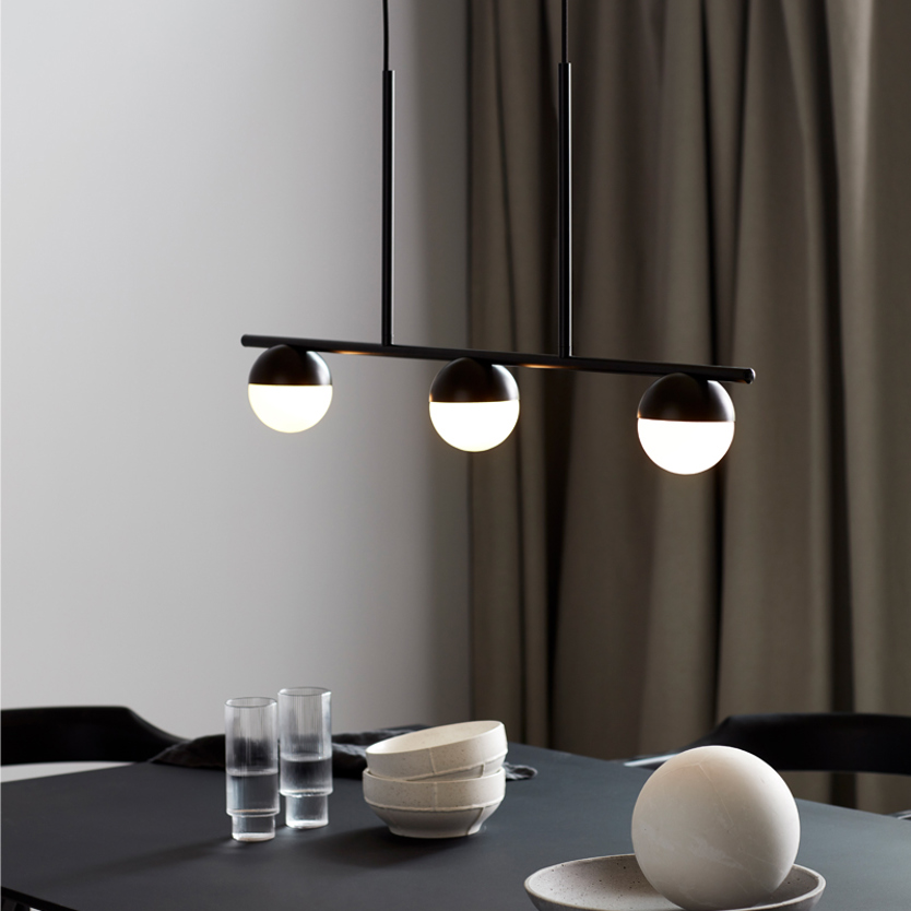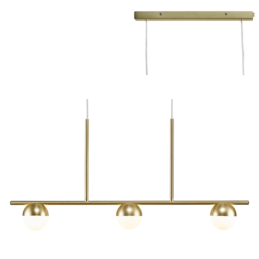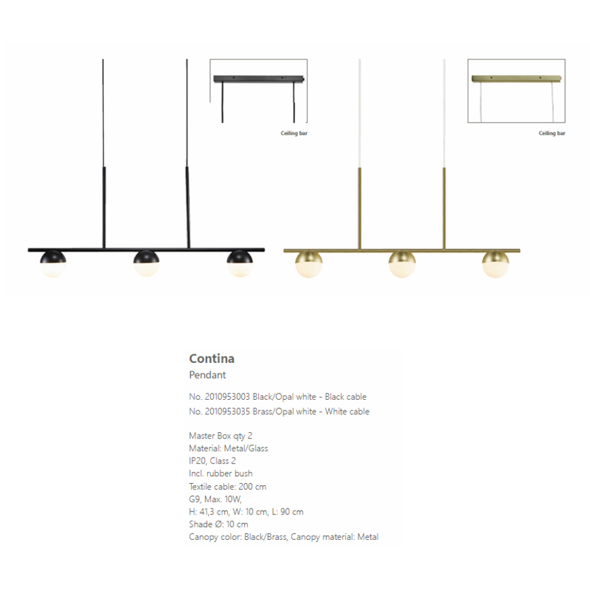 Product Code: 6N20109530xx Light source: 3 x 5W (max) | G9 Materials: Metal, Glass Dimensions: H 413mm x D 100mm x W 900mm The Contina pendant is a slim and minimalist design with opal mouthblown glass that gives a soft and glare-free light. Avaliable in a brass or black finish. Price shown for brass finish