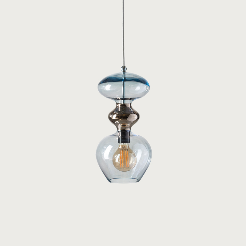 A blend of mouth-blown glass and metal finishes in a variety of colours.