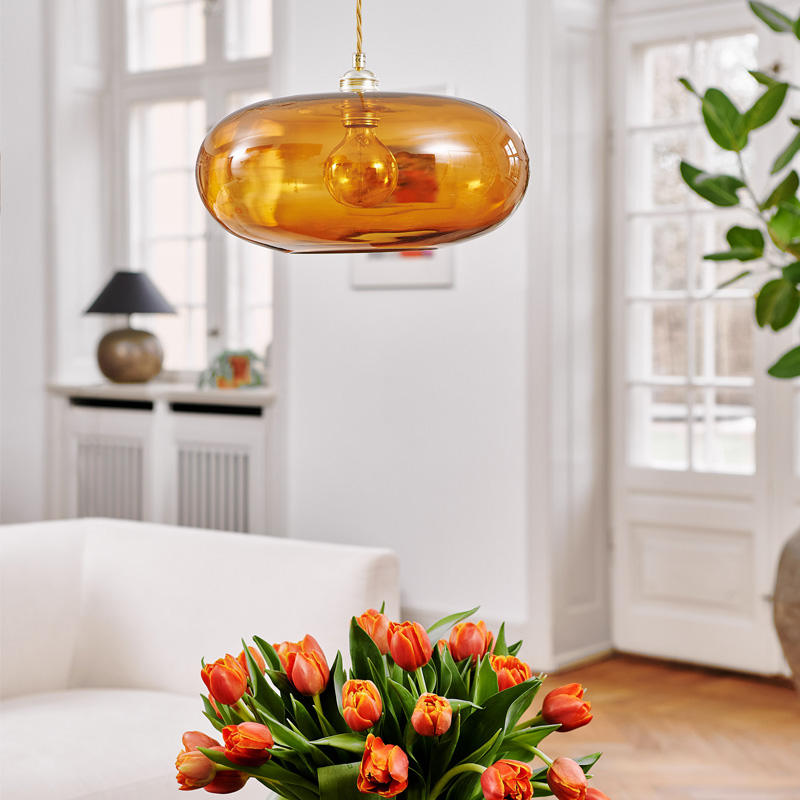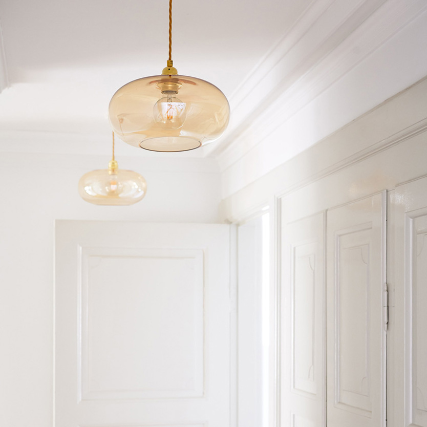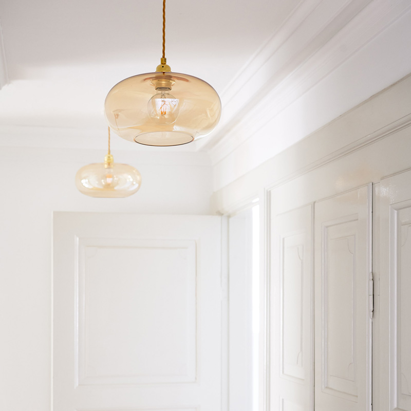A blend of mouth-blown glass and metal finishes in a variety of colours.
