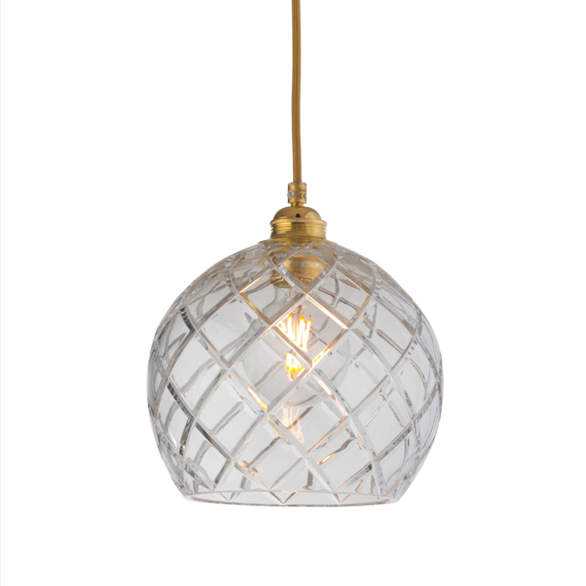 Product Code: 8ELA101522 Light source: 1 X E27 25W (max) LED Materials: Crystal, Metal Dimensions: Ø 220 mm x H 220mm | 2000mm Fabric Cable Suspension Brand: Ebb & Flow Being the first EBB & FLOW design, Rowan continues to be a classic, timeless design that works well in almost any space, thanks to its simple spherical shape and elegant twisted fabric cable. Available in a variety of cut crystal patterns and sizes, with either Gold or Silver cable and metalware. Rated IP20 suitable for indoor use. Designed in Denmark and hand-made in Europe.