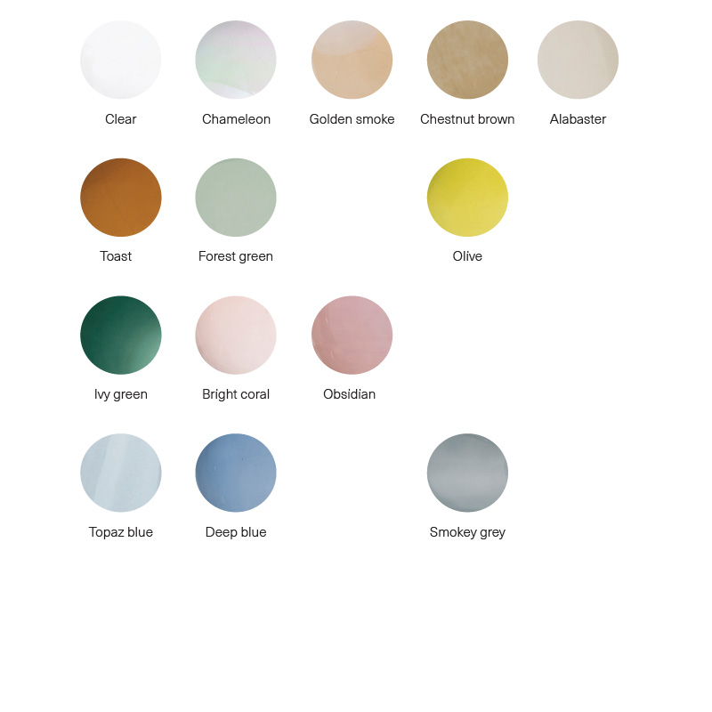 A blend of mouth-blown glass and metal finishes in a variety of colours.