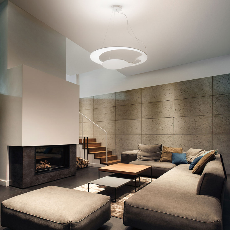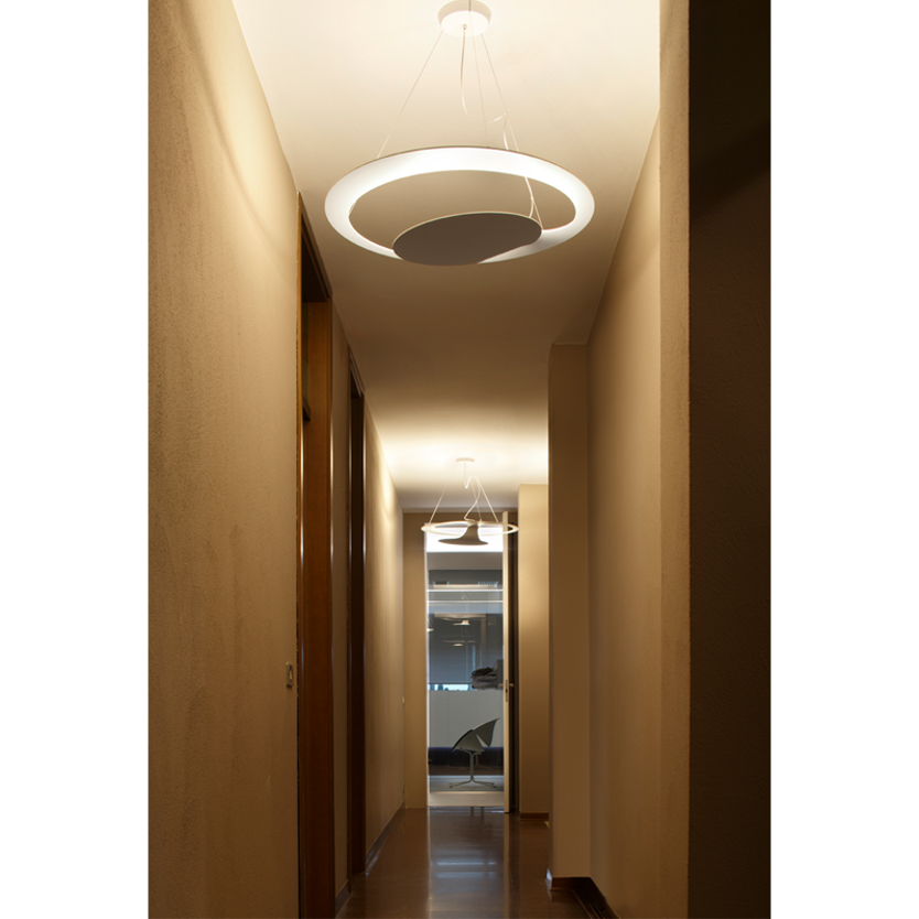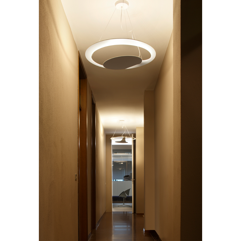 Product Code: 6FF31A01 01 Light source: 2 x 17W LED | 3000K | CRI80+ | Dimm Materials: Aluminium Dimensions: Ø 700mm x D 90mm | Max Hang Height 2600mm Brand: Fabbian The inspiration for Glu, designed by Pellegrini + Mengato Design, came from the rotation of a satellite around a planet, a dynamic element in continuous movement. The indirect light produced further emphasises the contrast between emptiness and fullness and creates interesting light and shadow effects. Rated IP20 suitable for indoor use. Dimmable with TRIAC dimming. Designed by Pellegrini + Mengato Design for Fabbian and made in Italy. For trade enquiries, please contact us below. |