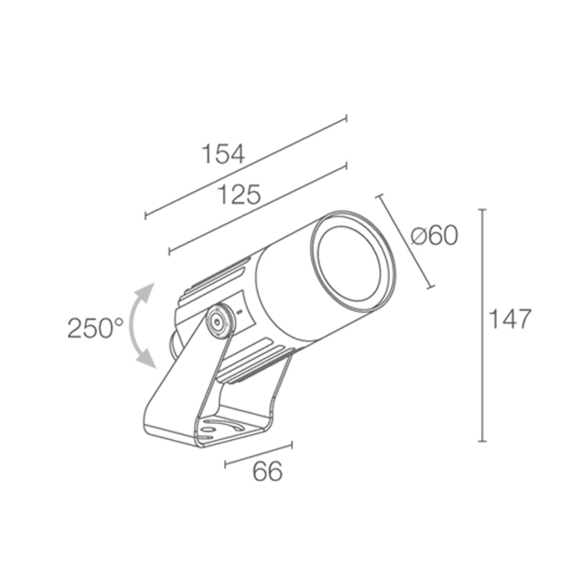 Product Code: 4LFS12007MH Light source: 1 x 13W | 4000k | 304lm | 24V Materials: Aluminium Dimensions: Ø 60mm x D 154mm Projector for outdoor applications. Body finished in either anodized aluminium, white or black; RAL finish on request. Beam options available are 24˚, 33˚, 60˚, 32˚ x 61˚ or 61˚ x 32˚. Power supply 24V IP66 Designed and made in Italy