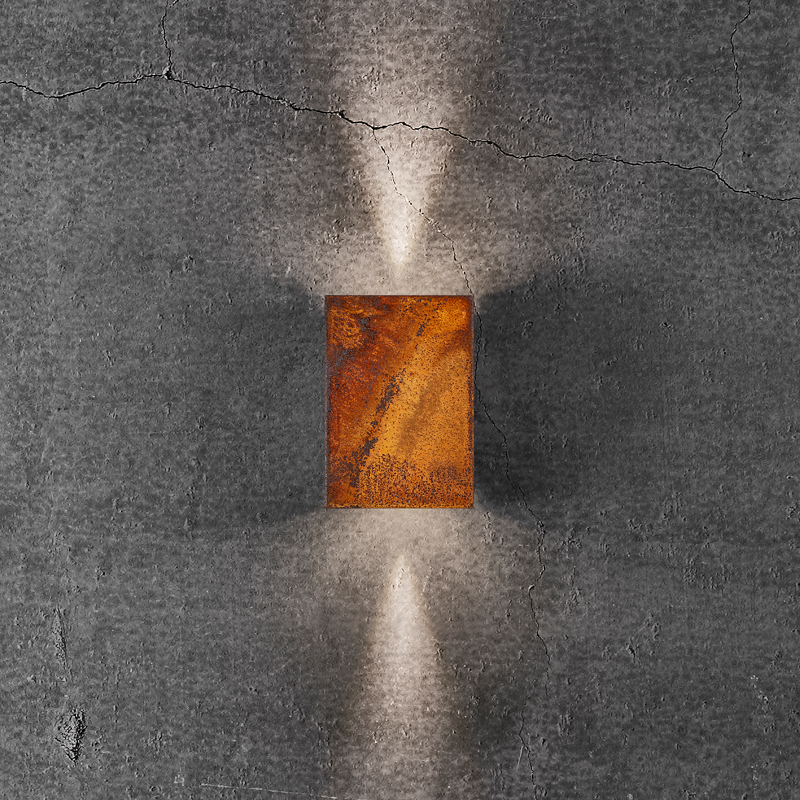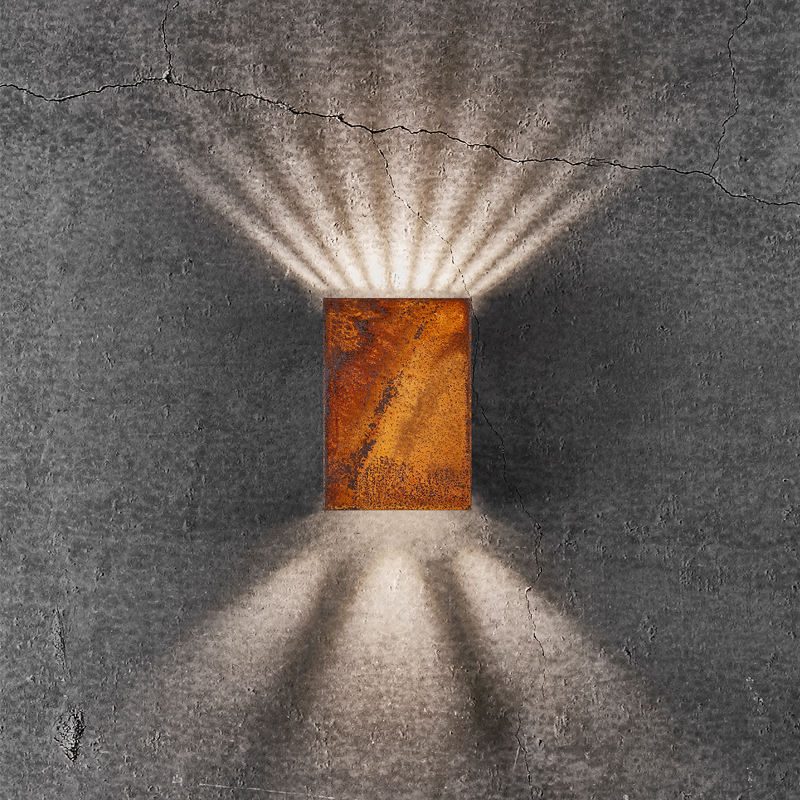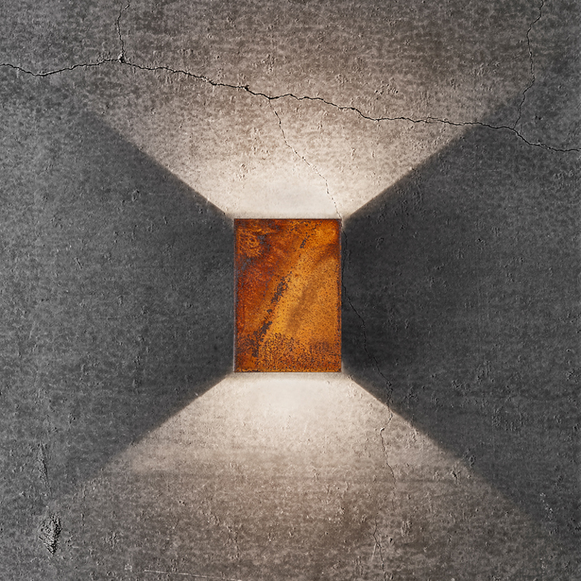 Product Code: 6N2019041038 Light source: 7.5W LED (Built-In) | 3000K | 450lm Materials: Corten Steel Dimensions: H 148mm x W 105mm x D 50mm BRAND: Nordlux Fold is brightly clear, where the selected details and latest LED technology are in focus. The magnetic shade makes the installation simple and the design distinct without visible screws. The light shines up and down, and the four included light-filter patterns change the light based on desire and personal style. Also available in other finishes and sizes (price varies). Rated IP54 suitable for outdoor use. Includes a 15-year anti-corrosion guarantee and 5-year LED guarantee. Non-dimmable. Designed by Bønnelycke MD for Nordlux Denmark. Corten is considered a living material, this finish will patina and change over time as the material adapts to its environment. It is recommended to let the frame weather before installation to prevent bleeding. For trade enquiries, please contact us below. RELATED ITEMS
