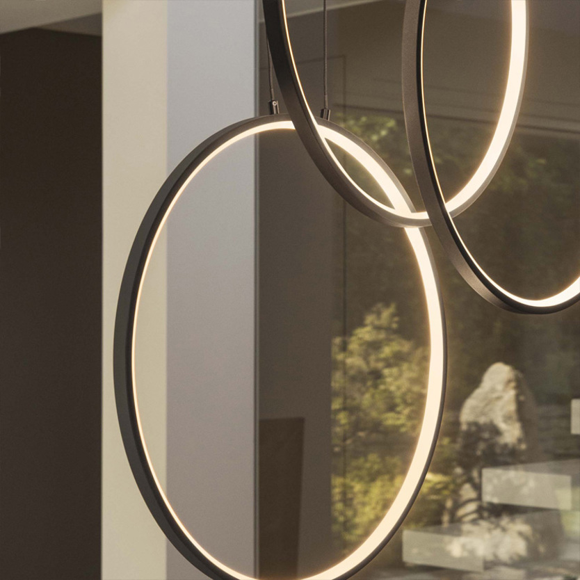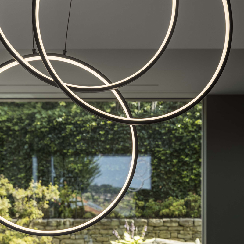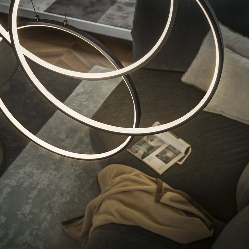Product Code: 8I269337 Light source: 82W LED | 3000K | 8950lm | CRI>90 Materials: Metal, Plastic Dimensions: H 600mm x W 685mm x D 130mm | 2490mm Max Hang Height Brand: Ideal Lux The Ideal Lux Frame Circles Pendant features three luminous rings that overlap in a striking geometric composition. Offering modern elegance and balanced illumination, it creates a bold focal point in contemporary living spaces. Available in Black or White. Rated IP20 suitable for indoor use. Non-dimmable. Includes a 5 year LED guarantee. Designed by Ideal Lux in Italy. For trade enquiries, please contact us below. RELATED ITEMS