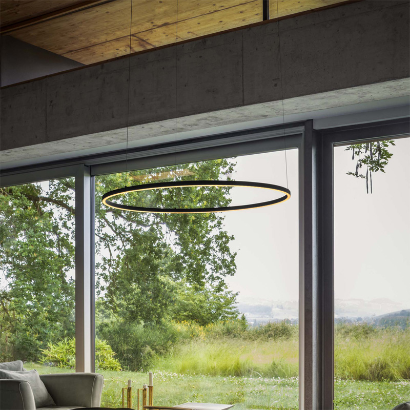 Product Code: 8I304427 Light source: 42W LED | 3000K | 4900lm | Dali Materials: Aluminium, Polycarbonate Dimensions: Ø 900mm x H 25mm | 2025mm Max Hang Height Brand: Ideal Lux The Oracle collection features a minimalist ring design that brings sophistication to any setting. Perfect for dining areas, meeting rooms, or open spaces, it casts a smooth, even light, creating an inviting ambiance. The Oracle Slim’s slim profile complements contemporary interiors without overpowering the space, offering both style and functionality. Available in Black or White, including other model variants (pricing varies). Rated IP20 suitable for indoor use. Dimmable with DALI / Push dimming. Includes a 5-year LED warranty. Designed by Ideal Lux in Italy. For trade enquiries, please contact us below. RELATED ITEMS