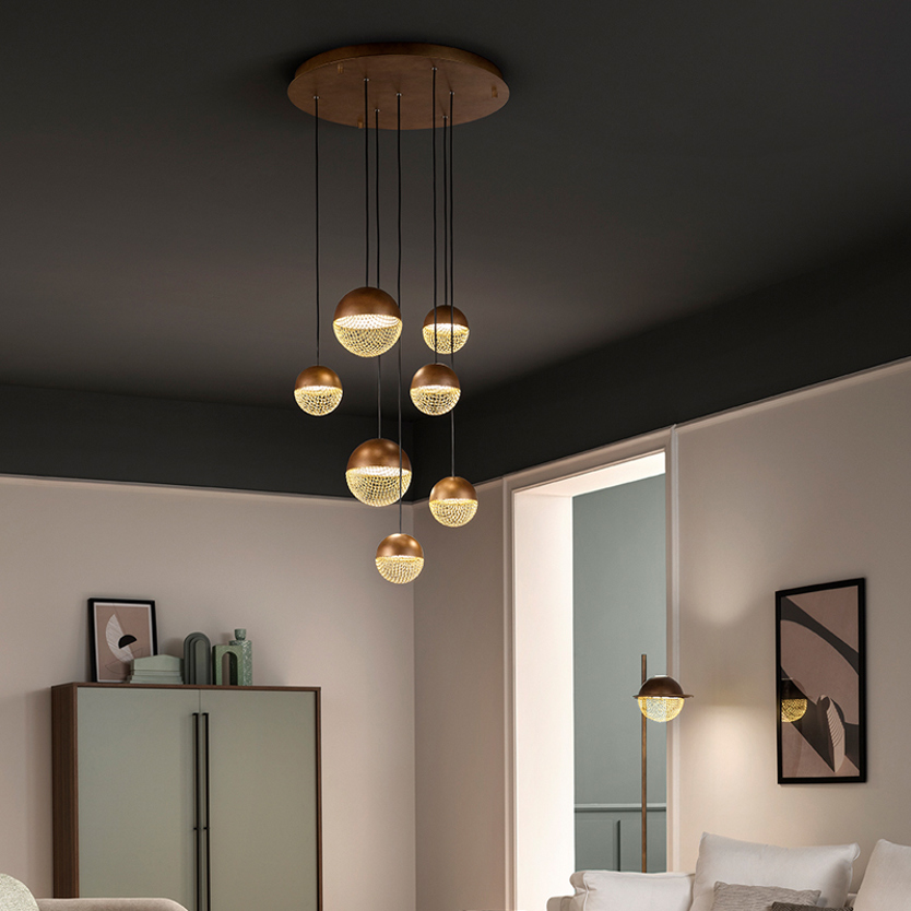 Product Code: 2MIGLU S7 Light source: LED 52.3W (Integrated) | 3000K | CRI 90 | 6700lm Materials: Metal Dimensions: Ø 600mm | 1500mm Suspension Cable Brand: Masiero Iglu is an intuition born from observing the perfection of the sphere, transformed into a perfect, recognisable and unique shape by woven mesh that creates a pattern of light and shadow, transforming the metal into a luminous jewel. The collection is comprised of a series of pendants, ceiling and wall lights available in various configurations, all featuring a Bronze Patina finish with woven Gold mesh. Dimmable 1-10V + PUSH. Designed by Oriano Favaretto and made in Italy. For trade enquiries, please contact us below. |