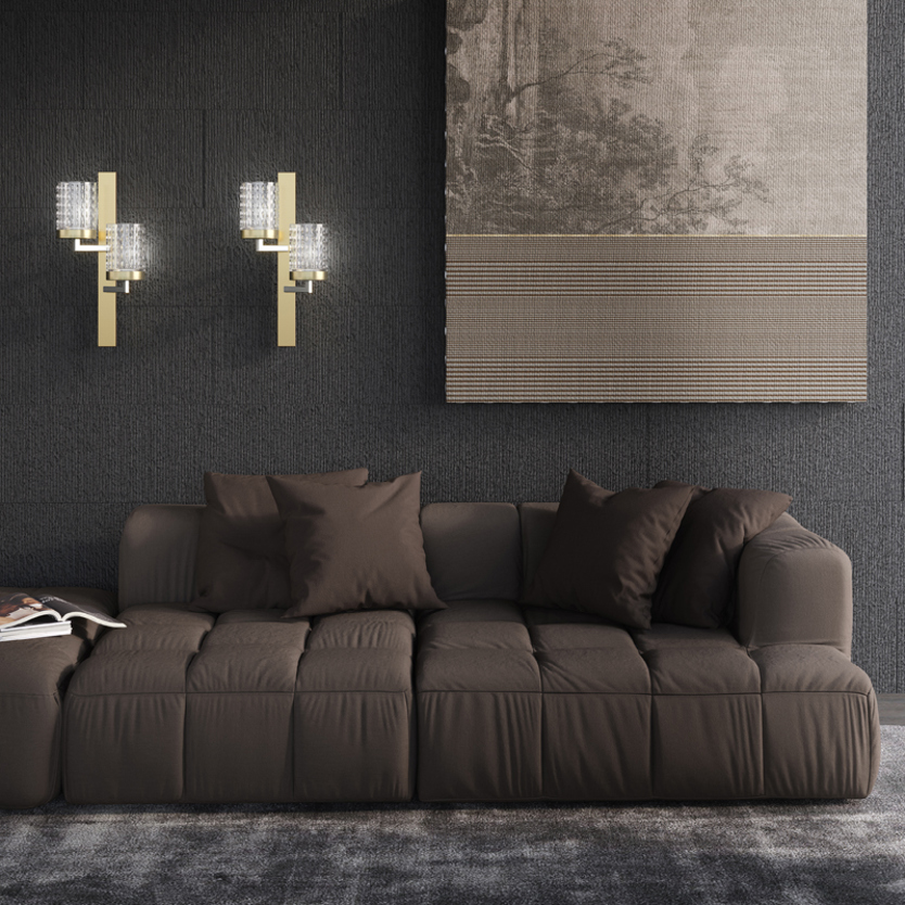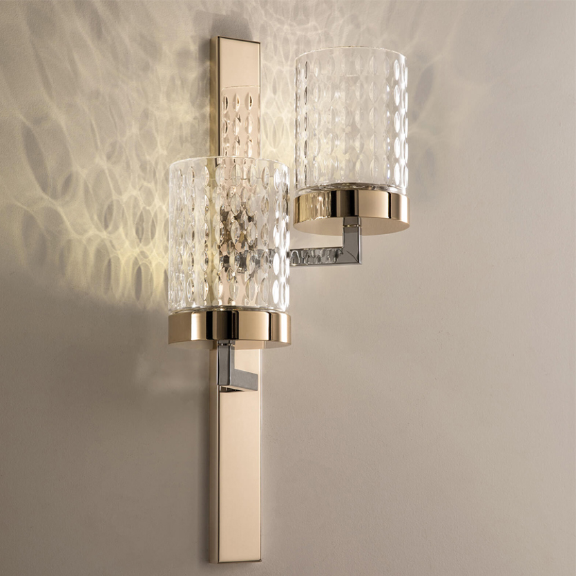 The Quarzo wall light features a metal with light gold and chrome finish along with a beautiful carved crystal glass diffusers. Available in different sizes