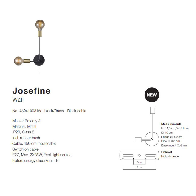 Product Code: 6N48941003 Light source: 2 x 28W | E27 | 240V Materials: Metal Dimensions: Ø 42mm x W 310mm x H 445mm The innovative and playful design makes Josefine a decorative and modern series. The stringent tube contributes to an industrial expression with associations to rough and modern decoration. In contrast to the industrial expression are the beautiful brass details and soft shapes, which result in an incredibly decorative series that balances minimalism and elegance in the finest possible manner. IP20 Designed in Denmark For trade enquiries, please contact us below. |