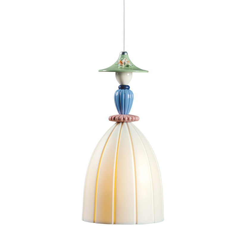 Product Code: 8L01023539 Light source: 1 x E27 15W LED (Max) | Not Incl. Materials: Porcelain, Metal Dimensions: Ø 170mm x H 350mm | 1950mm Max Hang Height Brand: Lladro The Mademoiselle collection is inspired by Lladró's romantic ladies, one of his most traditional motifs, to create contemporary and daring designs, full of color. The pieces combine opaque and translucent porcelain; white and colored, with matte and glossy parts. The Mademoiselle series is available in various designs, clusters and sizes (pricing varies). Rated IP20 suitable for indoor use. Dimmable with dimmable globe. Designed by Dept. Diseño y Decoración for Lladro and made in Spain. Please note that porcelain products are handmade and the exact size, colour and texture of each piece may vary. For trade enquiries, please contact us below. |