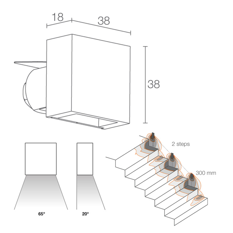 Product Code: 4LSP20125DAT Light source: 1 x 2W LED | range of LED colours available|diffused beam angle |28 lm (3000K 500mA) Materials: Aluminium body Dimensions: 38mm x 38mm x D 48mm (depth of fitting only) Brand: Luce and Light Semi-recessed step light suitable for indoor and outdoor use available Black, Corten and White (price varies).Colour Temperature: 2700K, 3000K, 4000K, 5000K, Blue | Diffused Optics | Various Cable Lengths (price varies). Rated IP54 suitable for outdoor use.Designed and made in Italy. For a detailed Technical Data Sheet, click here For trade enquiries, please contact us below. RELATED ITEMS