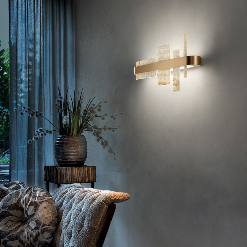 Brand: Masiero Beautiful natural Onyx interior wall light with matte Gold detailing. Available in assorted sizes and pendant versions (prices vary). Designed by Oriano Favaretto. Designed and made in Italy. 0-10V dimming only IP20