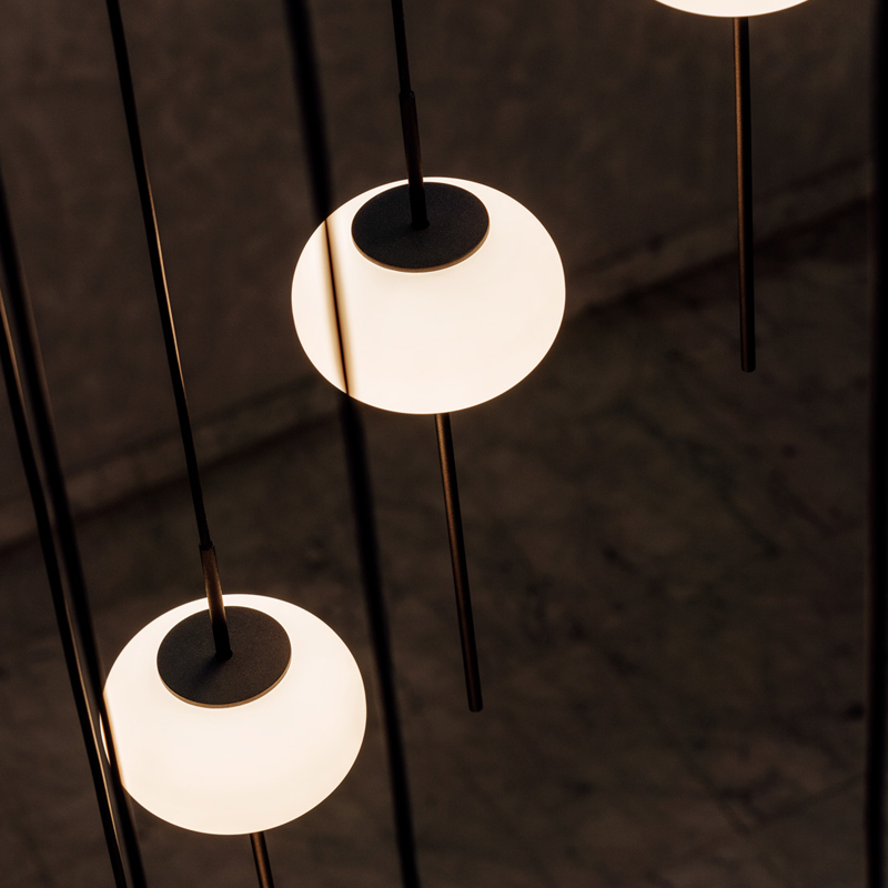 Product Code: 8M6937, 8M2383 Light source: 2 x G9 LED (not incl.) Materials: Glass and Zamak Dimensions: Ø 150mm x H 460mm | Max cord length 3000mm Brand: Milan Satin triplex opal blown glass serves as the light emitting centre of this galaxy, floating in place and accentuated by the elongated supports made of high-strength injected Zamak. Includes ceiling mount canopy. Dimmable. Designed by Martín Azúa and made in Spain.