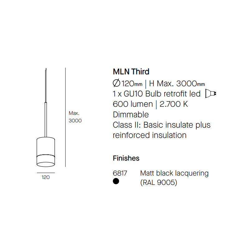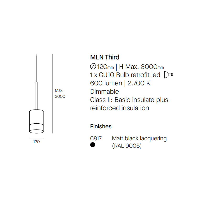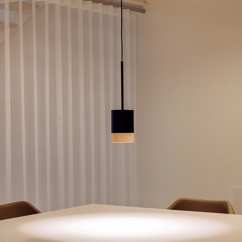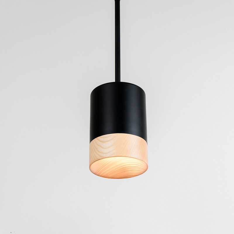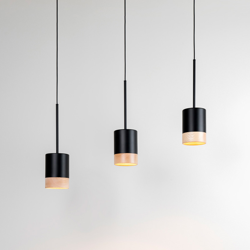Product Code: 8M6817 + 8M2383 Light source: 1 x GU10 | 2700k | 600lm Materials: Steel, ash wood Dimensions: Ø 120mm x H 3000mm The body structure of Third is divided into three equal parts, two of which make up the head stamped in lacquered steel and the third part is a diffusing shade carved in ash. The light distribution of this pendant lamp is focused and generates a halo of subtle light. Like the head, the base fixed to the ceiling is also made of matte black lacquered steel.