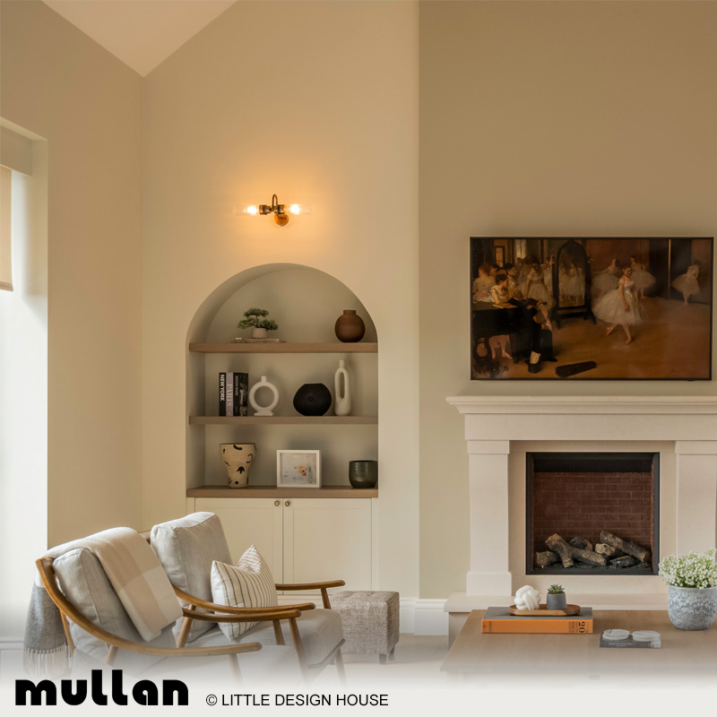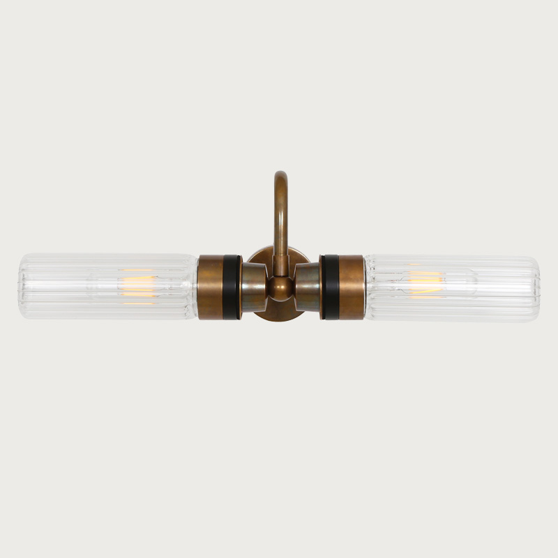 Product Code: 6MMLBWL148ANTBRS Light source: 2 x E27 Tubular 6.5W (Max) | Not Incl. Materials: Brass, Glass Dimensions: H 150mm x W 470mm x D 220mm | Base Ø 85mm Brand: Mullan The Nevis Double Glass Wall Light exudes charm with an elongated silhouette, enhanced by delicately textured rippled glass shades that subtly diffuse light. Ideal for mounting above mirrors or vanities, this wall light complements contemporary and transitional spaces alike. Available in a variety of brass finishes and powder coat colours, with rippled or clear glass. Rated IP65 suitable for indoor and bathroom use. Dimmable with dimmable globes. Designed by Mullan and made in Ireland. This product is made from real brass and is considered a living material. Depending on the finish chosen, it will patina over time as the material adapts to its environment. For trade enquiries, please contact us below. |