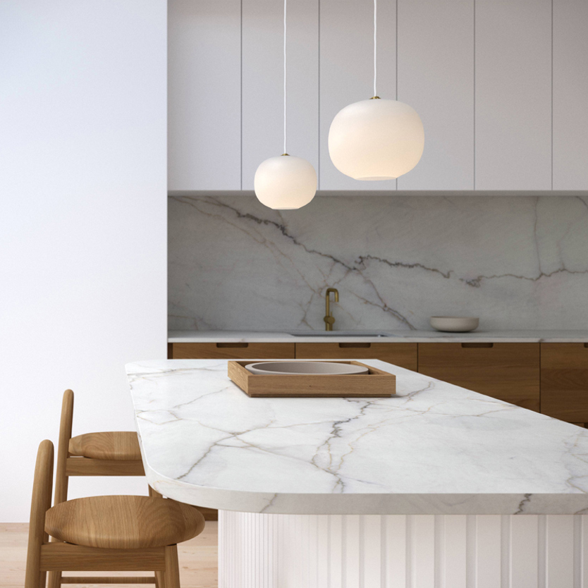 Product Code: 6N2220433001 Light source: 1 x E27 40W (max) | Not Incl. Materials: Glass, Metal Dimensions: Ø 200mm x H 184mm | 3000mm Fabric Cable Suspension Brand: Nordlux Navone is designed by Danish design studio Mavro//Lefèvre by Sofie Lefèvre. The overall shape of the shade is soft and round, yet the very subtle curved base adds a new dimensions that transforms the lamp into more than just a sphere. The fine brass detail adds a contemporary touch, underlining the suspended lightness of the lamp. Rated IP20 suitable for indoor use. Dimmable with compatible globes. Designed by Sofie Lefèvre for Nordlux Denmark. For trade enquiries, please contact us below. |