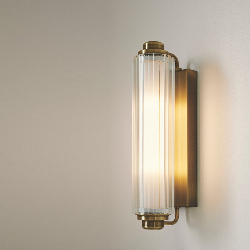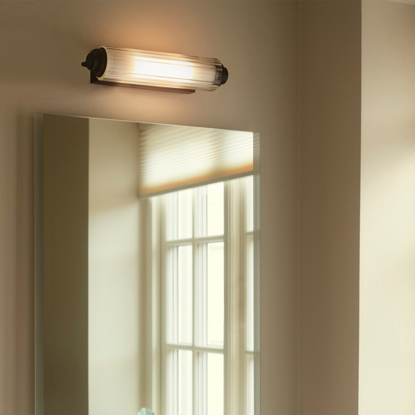 Product Code: 6N2310521035 Light source: 2 x E14 25W (Max) | Not Incl. Materials: Plastic, Metal Dimensions: H 350mm x W 78mm x D 125mm | Base H 265mm Brand: Nordlux The Nimal series is produced in a round and elegant Art Deco design with a beautiful ribbed shade. The opal white diffuser ensures a pleasant light. This wall lamp creates the perfect ambience above or beside your bathroom mirror. Available in Brass or Black (price varies). Rated IP44 suitable for bathrooms and outdoor use. Dimmable with dimmable globes. Designed by Nordlux Denmark.
