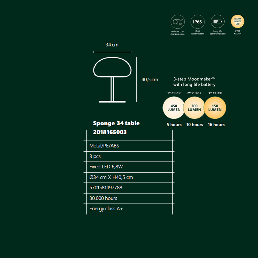 BRAND: Nordlux Sponge is named after sponges in the forest, where the inspiration for design, shape and expression also is found. The simple design and soft shapes make Sponge an incredibly elegant series, suitable inside and outside the home. With the built-in battery, Sponge can be placed and moved as you like and simultaneously, the brightness of the light can be adjusted in three levels. The battery has a durability up to five hours at full power and even longer if the light is turned down to a cozy lighting. The battery is easily charged via the included USB cable.