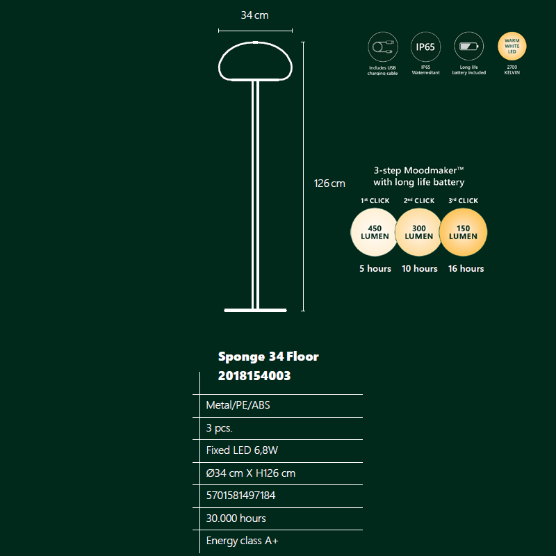 BRAND: Nordlux Sponge is named after sponges in the forest, where the inspiration for design, shape and expression also is found. The simple design and soft shapes make Sponge an incredibly elegant series, suitable inside and outside the home. With the built-in battery, Sponge can be placed and moved as you like and simultaneously, the brightness of the light can be adjusted in three levels. The battery has a durability up to five hours at full power and even longer if the light is turned down to a cozy lighting. The battery is easily charged via the included USB cable.Sponge is made of hard plastic and is durable against wind and water. IP65 Designed in Denmark Dimmable