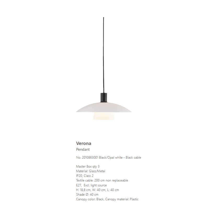 Product Code: 6N2010863001 Light source: 1 x E27 Materials: Metal, Glass Dimensions: Ø 400mm x H 188mm The Verona pendant is a traditional and classic design with two opal glass shades and a matte black metal frame.