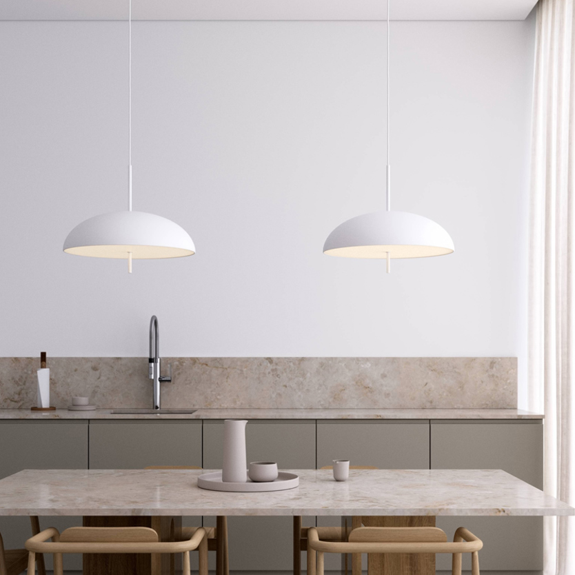 Product Code: 6N2220053003 Light source: 2 x E27 15W (max) | Not Incl. Materials: Metal, Plastic Dimensions: Ø 495mm x H 410mm | 2500mm Fabric Cable Suspension Brand: Nordlux The Versale series by Anker Studio is the epitome of Scandinavian minimalism cut to the very core. A perfectly round shade with a uniform light surface only disturbed by the piercing frame. The pendant can easily set the perfect ambience for your dining area with a pleasant, glare-free light. Available in either Black, White or Silk Beige. Rated IP20 suitable for indoor use. Dimmable with compatible bulbs. Designed by Anker Studio for Nordlux Denmark. For trade enquiries, please contact us below. |