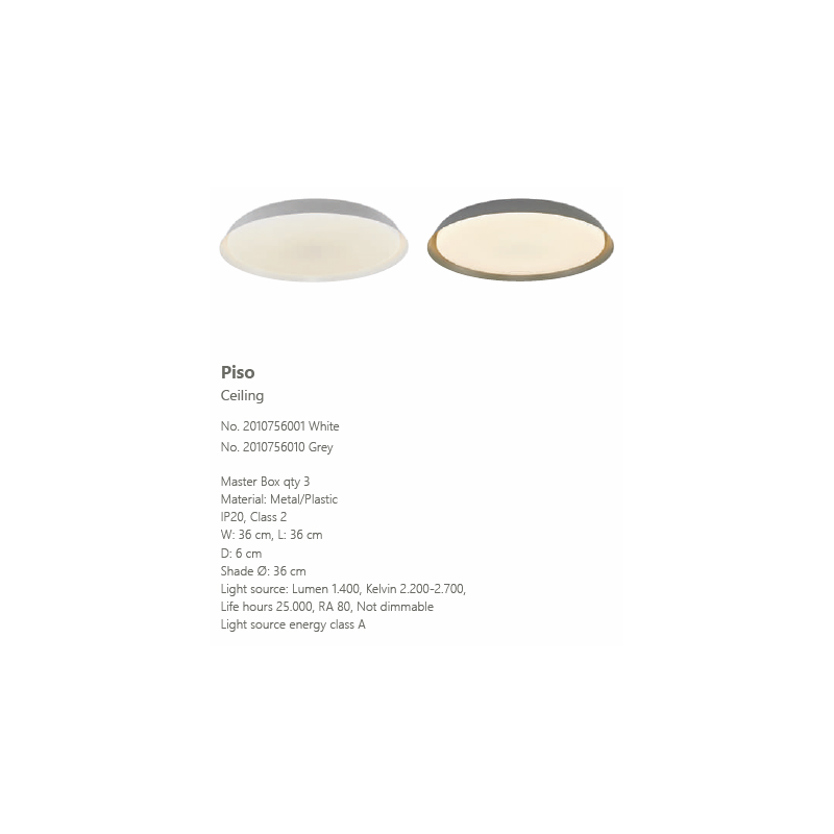 Product Code: 6N2010756001 Light source: 1 x 22.3W LED (Fixed) | 2700K-2200K | 1600lm | CRI 80 Materials: Metal/Plastic Dimensions: Ø 360mm x D 60mm The Piso ceiling light is a minimalist and timeless design with a beautiful diffused light that fills the entire shade. Piso has a matte metal finish that is available in grey or white.