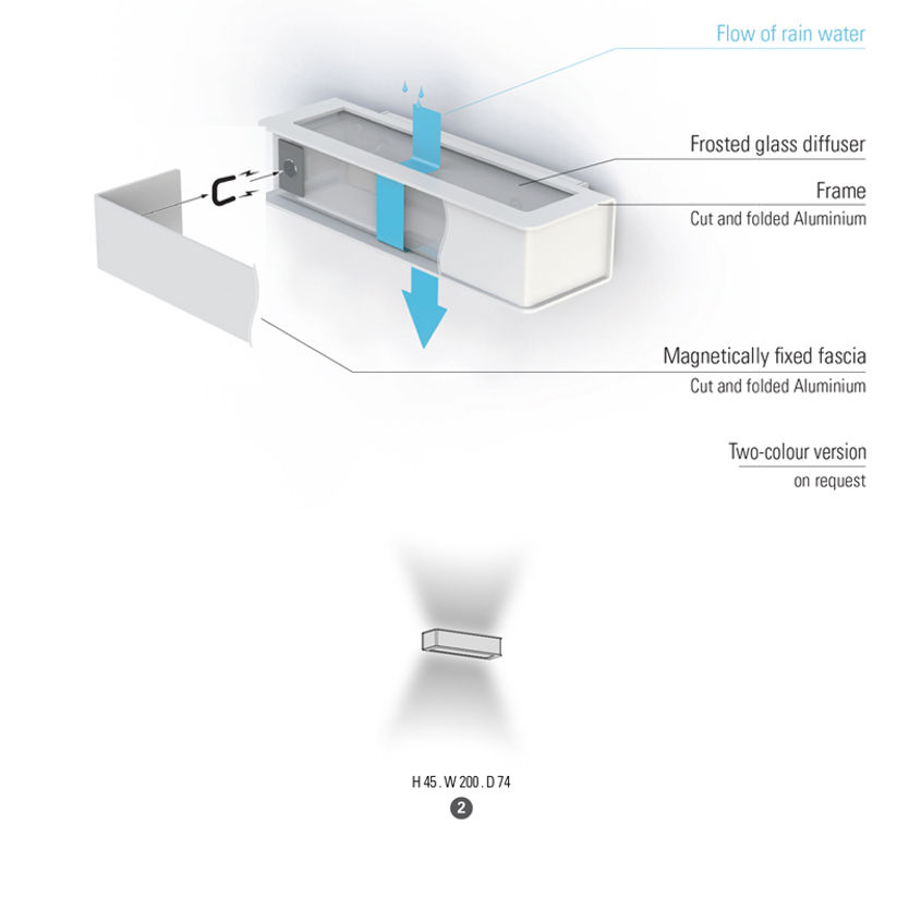 Product Code: 8R190002066 Light source: 2 x G9 9W (max) | Not Incl. Materials: Aluminium, Glass Dimensions: H 45mm x W 200mm x D 74mm Brand: Roger Pradier Plemo features a frosted glass module set in a precision cut Aluminium frame, surrounded by a magnetically fixed, protective and decorative fascia that conceals the lighting module within. The unit boasts a unique fixing mechanism which locks in and out by simply pivoting the lamp, making it easy for the user to affix and making installation and replacement of the lamp easy. It is completely waterproof, and is designed to shed dust and dirt thanks to a shallow guttering system that enables air and water to run down from the top of the lamp over its surface. Available in a wide range of colours. Rated IP65 suitable for outdoor use. Designed by Stéphane Joyeux and made in France. For trade enquiries, please contact us below. |