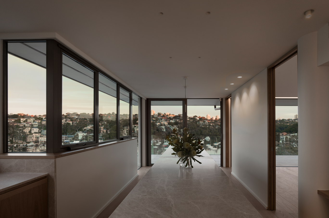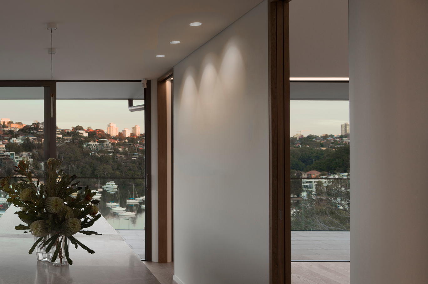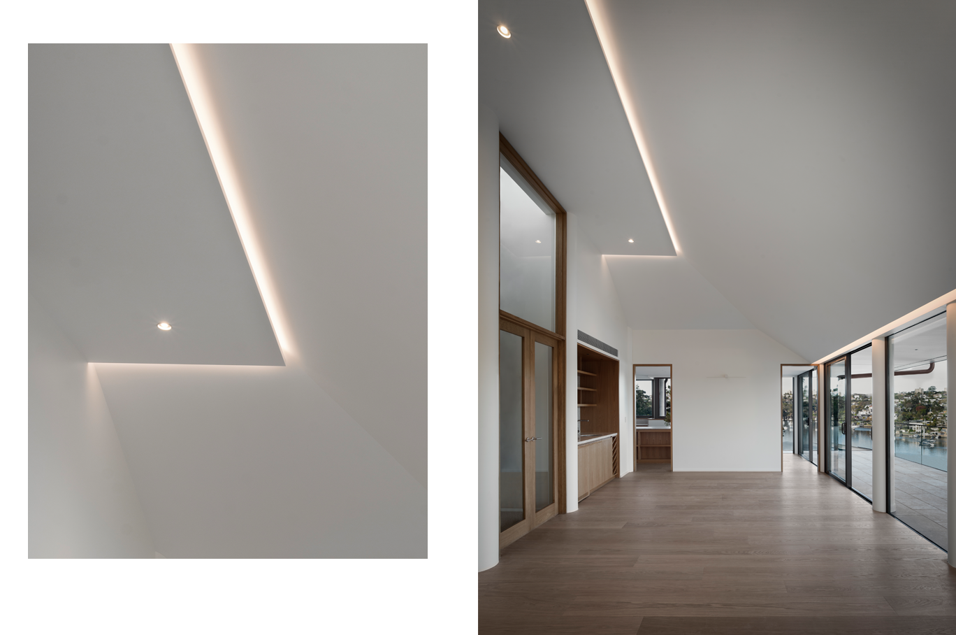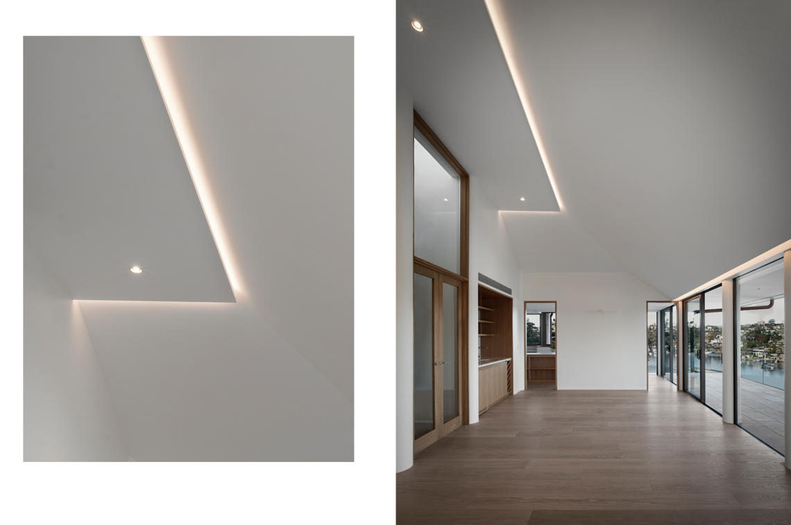 Initially engaged for landscape lighting, SL Studio’s role expanded to the entire property as the project evolved. The steep waterfront site required thoughtful solutions for pathway and inclinator lighting, while the mix of renovation and new-build elements posed structural challenges. High, sloped ceilings added complexity, demanding strategic fixture placement. Through careful planning and collaboration, we delivered a cohesive lighting design that enhanced both function and atmosphere.