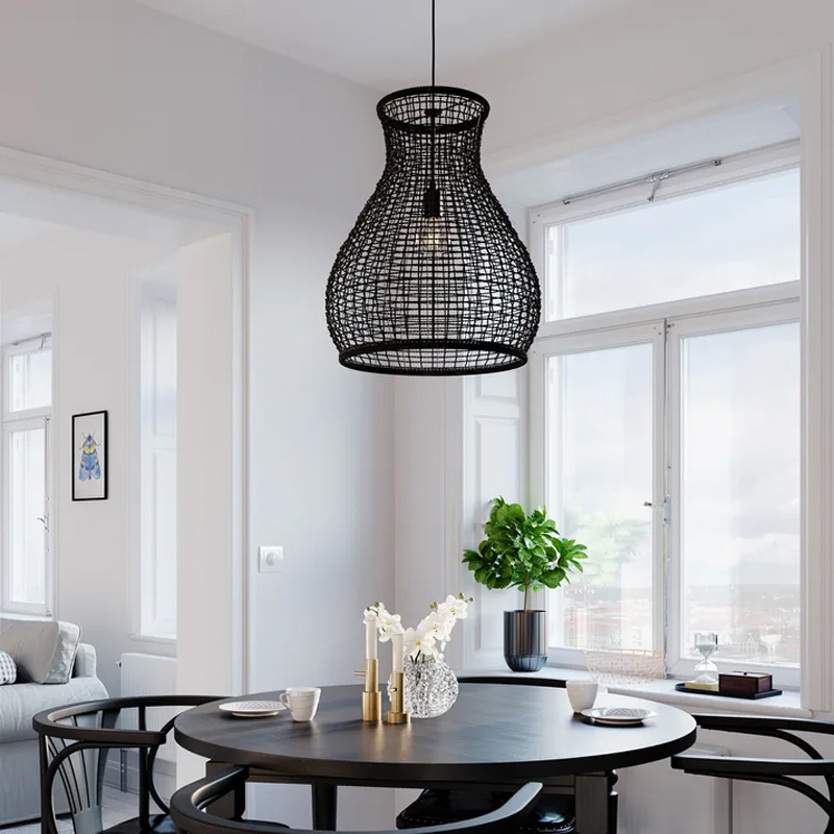 Product Code: 4B4200010-4000 Light source: 1 x E27 60W (Max) | Not Incl. Materials: Metal, Fiber Dimensions: Ø 480mm x H 550mm | 1200mm Cable Suspension BRAND: By Rydens The Seagrass pendant features natural materials shaped by a metal frame. Available in natural or black. Suitable for indoor use only.
