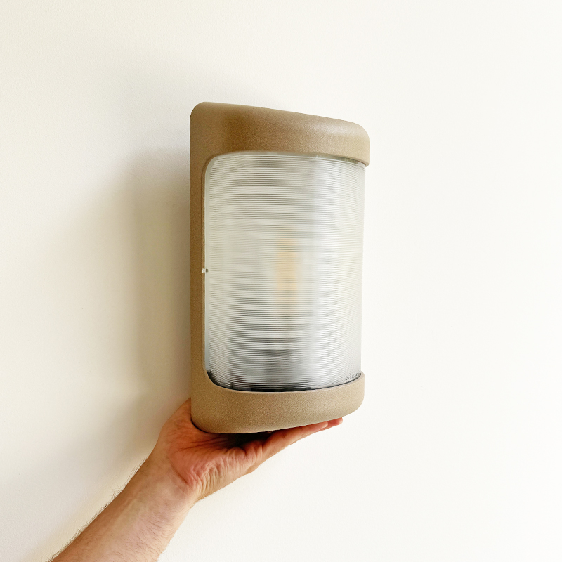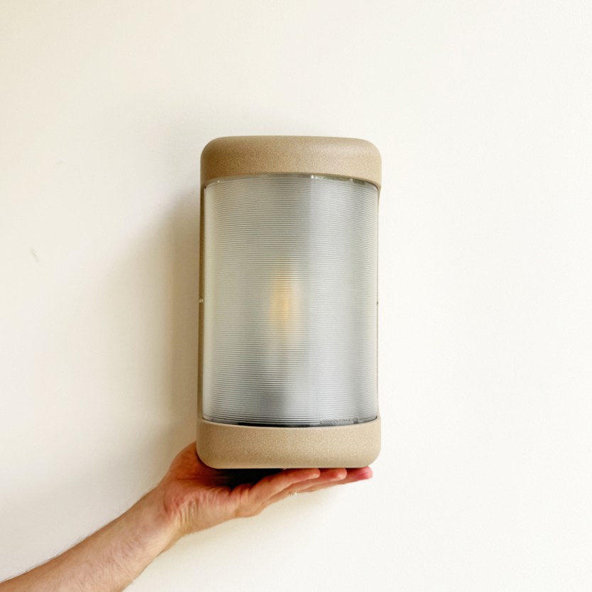 This outdoor wall light features a retro-inspired design, with a ribbed polycarbonate shade which helps to diffuse the light source within. Finished in a sandstone colour. Rated IP44 suitable for outdoor use. Designed and made in France. 1 EX DISPLAY For trade enquiries, please contact us below. RELATED ITEMS
