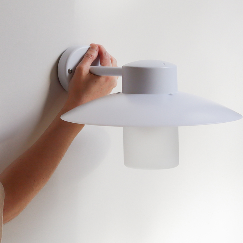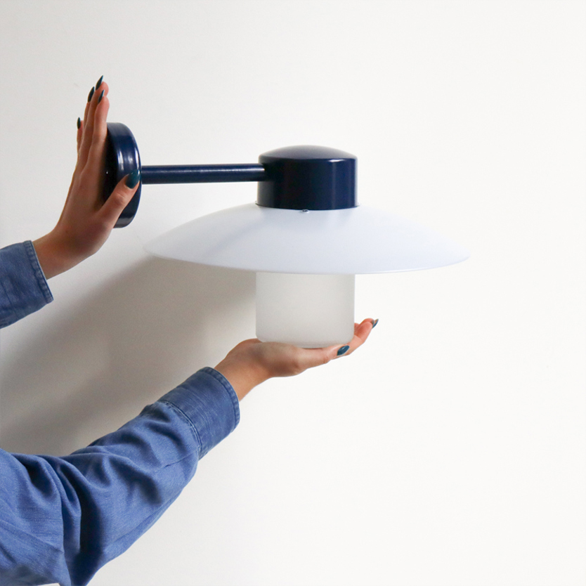 Product Code: 8R101001xxx Light source: 1 x E27 23W (Max) | Not Incl. Materials: Aluminium, Glass, Polycarbonate Dimensions: H 200mm x W 330mm x D 390mm Brand: Roger Pradier This outdoor wall light features a modern design, perfect for beside entryways to provide pleasant, glare-free illumination. The structure of the body is finished in dark blue, while the white polycarbonate shade adds a touch of character. The light source is housed inside a frosted glass cylinder which can be unscrewed for ease of access to the globe. Rated IP44 suitable for outdoor use. Designed by Stéphane Joyeux for Roger Pradier and made in France. For trade enquiries, please contact us below. RELATED ITEMS