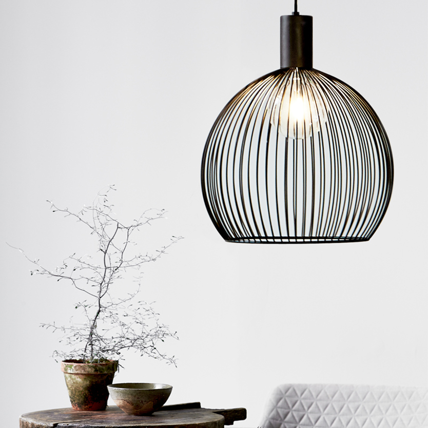Product Code: 6N84253003 Light source: 1 x E27 60W (max) | Not Incl. Materials: Metal, Plastic Dimensions: Ø 400mm x H 455mm | 3000mm fabric cable suspension Brand: Nordlux Aver is a pendant light that breaks with tradition with its visible light bulb behind the curved metal threads delivering on both beautiful light and fascinating shadow play. Available in other sizes (price varies). Rated IP20 suitable for indoor use. Designed in Denmark by Carlo Volf. For trade enquiries, please contact us below. |