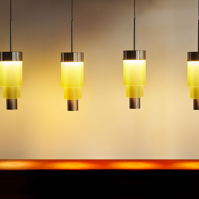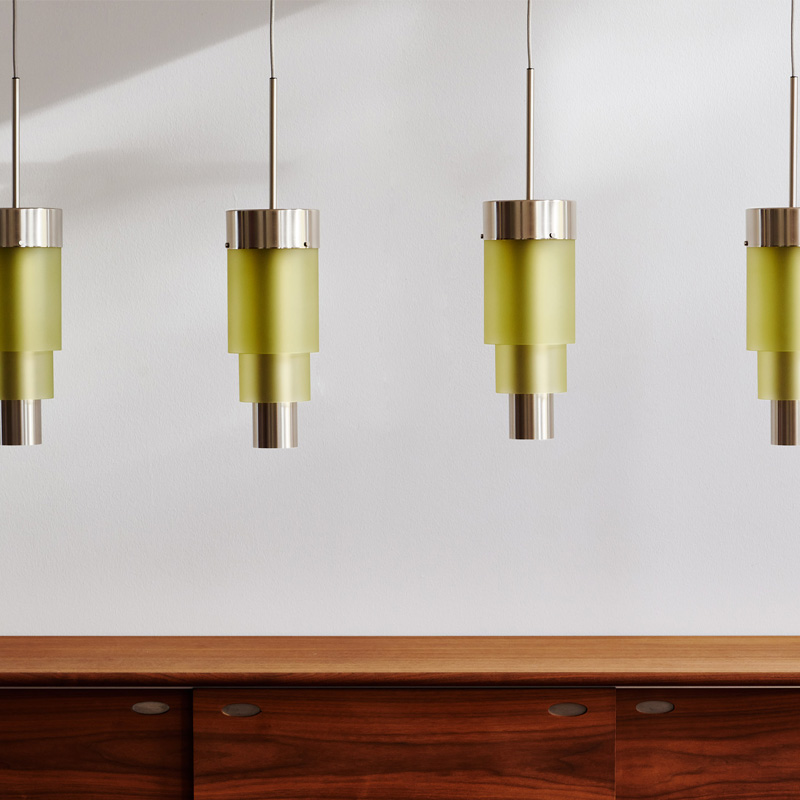 A blend of mouth-blown glass and metal finishes in a variety of colours.