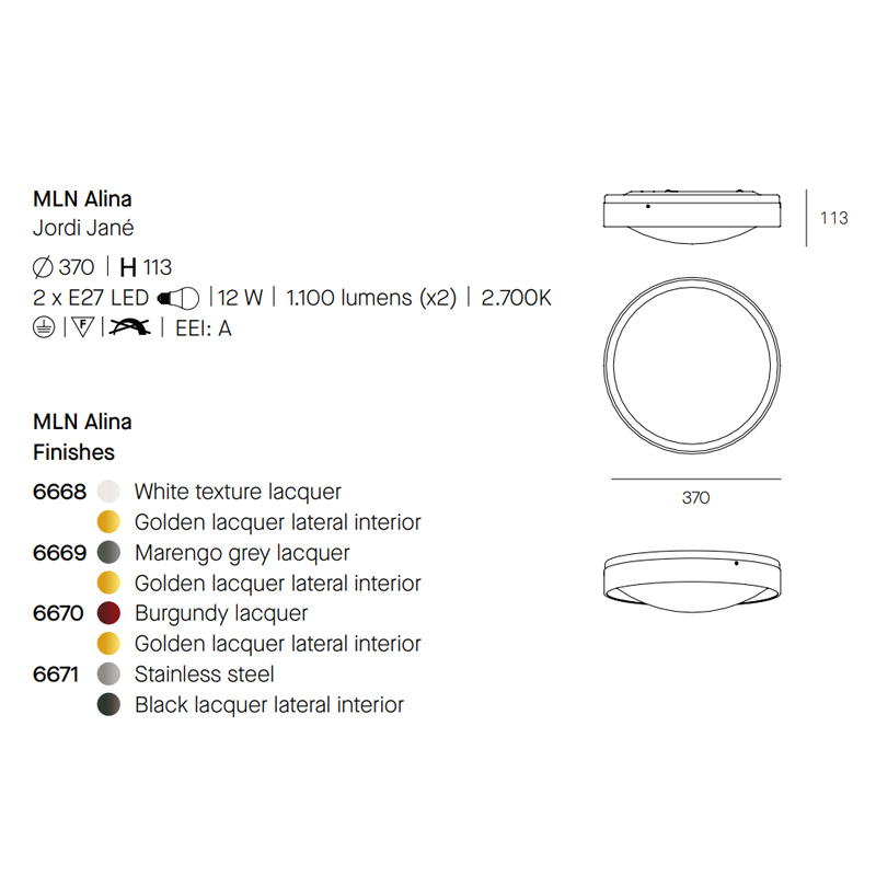 Product Code: 8M6669 Light source: 2 x 12W E27 LED | 2700k | 1100lm (x2) Materials: Stainless steel, PMMA Dimensions: Ø 370mm x H 113mm A ceiling light in two sizes, 370 and 500 mm, with a ceiling fixture base in translucent polymethyl-methacrylate (PMMA) with satin-finish on both sides. Decorative ring in stainless steel and textured white, charcoal grey or burgundy lacquer. Diffusing shade in polymethyl-methacrylate (PMMA), thermoformed with black sides for the stainless steel model and gold lacquer for the other finishes. Price varies between finishes. Designed by Jordi Jané & Made in Spain Dimmable