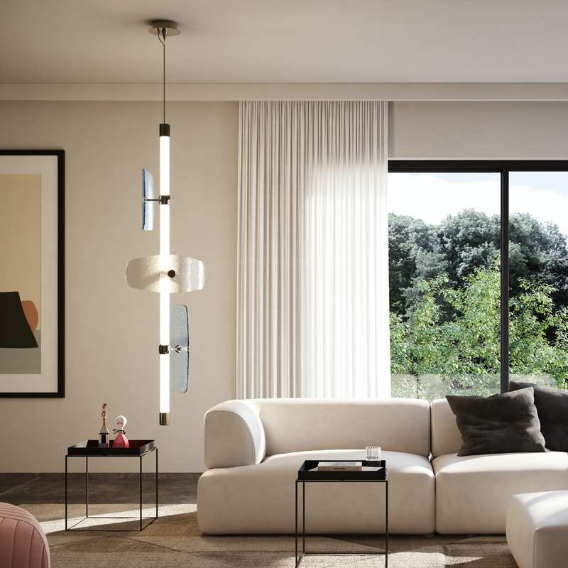 Product Code: 6I01805SO0001 Light source: 3800lm | 4000K | CRI>90 Materials: Metal, Glass Dimensions: L 1690mm x H 320mm x W 320mm | 1000mm Cable Brand: Italamp Axi is a chandelier with a 'retro-futurist' aesthetic, composed of a tubular structure in white borosilicate glass containing an LED light source. The design is interspersed with metal elements from which, extend arms whereby coloured art glass panels are fixed, gravitating around the central element. These elements have a curved and textured surface, which filters the light with plays of transparency and refraction. Rated IP20 suitable for indoor use. Customizations available on request. Dimmable 0-10V, other dimming standards available on request. Designed by Patrick Jouin iD and made in Italy. For trade enquiries, please contact us below. |