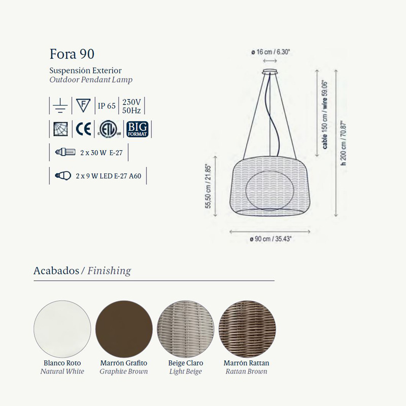 Product Code: 6B4030301/P707C Light source: 2 x E27 30W (max) Materials: Synthetic polyethylene fiber shade with aluminum frame Dimensions: Ø900mm H: 550mm. Chord length 1500mm
