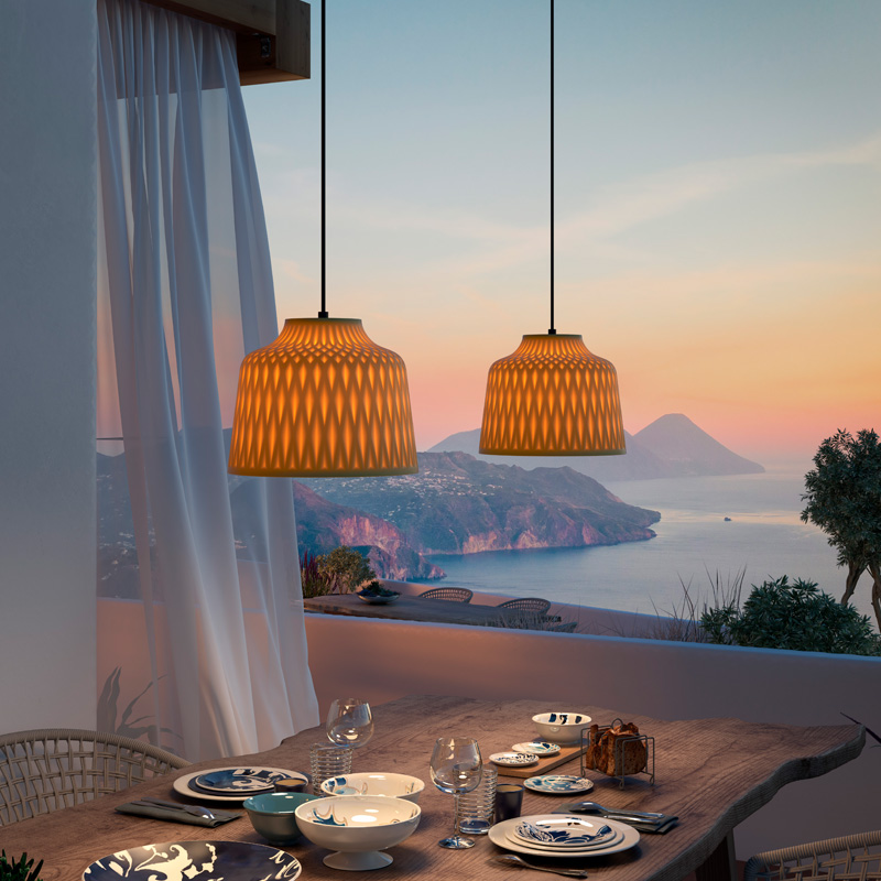 Product Code: 6B36302202188 Light source: 1 x E27 15W LED (max) | Not Incl. Materials: Aluminium, Silicone, Polycarbonate Dimensions: Ø 300mm x H 240mm | 2000mm Suspension Cable Brand: Bover Soft light fixtures are light and colourist, with a fresh appearance that projects a diffused, direct lower light shaded by a polycarbonate diffuser. Made in silicone, the print on their shade is a reminder of classic wine glasses made of Bohemian glass. Soft lights adapt to all preferences and both indoor and outdoor spaces. They can easily be disassembled for cleaning. Rated IP44 suitable for outdoor use. Dimmable with compatible globe. Designed by Danos Salgados and made in Spain. For trade enquiries, please contact us below.  |