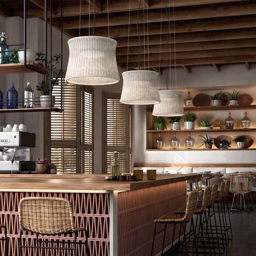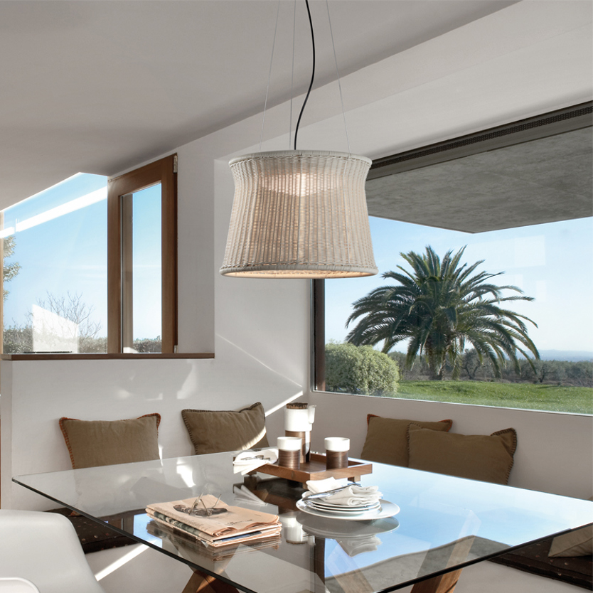 Product Code: 6B26401201100 Light source: 20W LED | 2700K | CRI90 Materials: Aluminium, Iron, Polyethylene Dimensions: Ø 450mm x H 325mm | 1775mm Max Hang Height Brand: Bover Warm, tactile, and timeless—the Syra Pendant is handwoven from non-toxic, recyclable polyethylene fibre, offering the natural look of rattan with enhanced durability. Its soft curves and subtle texture cast a welcoming glow, making it perfect for dining spaces, sunrooms, or anywhere you want to bring a touch of Mediterranean ease indoors. Available with an Ivory or Brown Shade, also in other sizes (price varies). Rated IP20 suitable for indoor use. Dimmable with TRIAC, other dimming on request. Designed by Alex Fernández Camps & Gonzalo Milà for Bover, and made to order in Spain. For trade enquiries, please contact us below. RELATED ITEMS