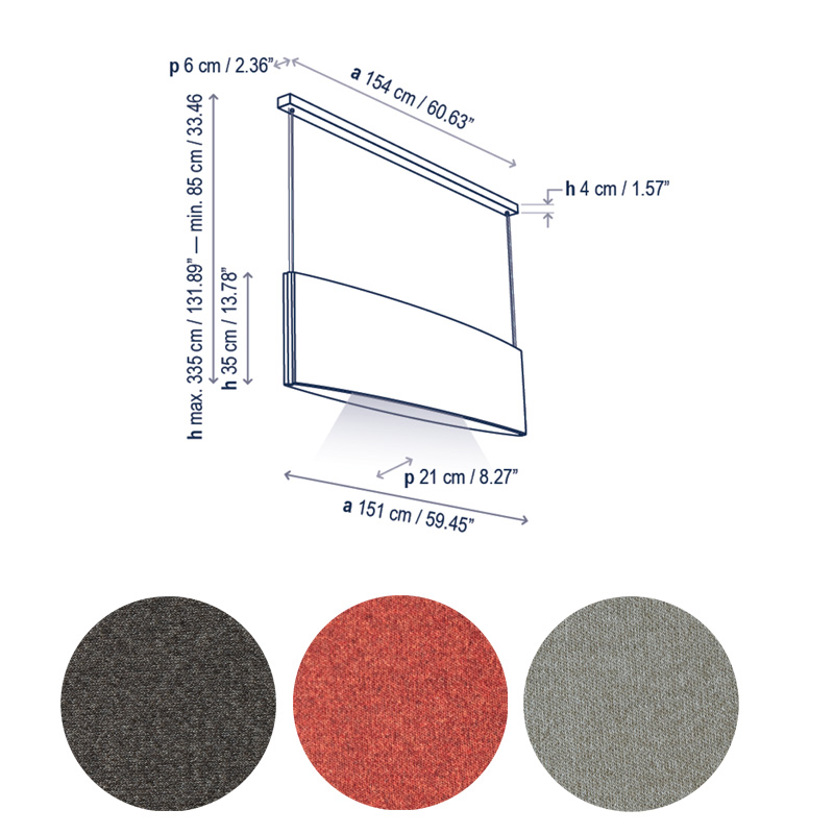 Product Code: 6B11630230197 Light source: 20.5W LED (Built-In) | 3000K | CRI95 | 3000lm Materials: Aluminum, Basotect Sound Absorbing Foam, Crevin Fabric, MDF Dimensions: H 350mm x W 1510mm x D 210mm | 2960mm Cable Suspension Brand: Bover Noren takes its name from the pieces of fabric that were traditionally used as curtains in Japanese homes to divide different areas, replacing walls, doors or windows. Inspired by this Japanese tradition, the Noren collection are lightweight, decorative light structures with sound-absorbing panels which, when combined together, help to coordinate the space by integrating sound and light. Rated IP20 suitable for indoor use. Acoustic absorption class: aw A Dimmable with Casambi, 1-10V - Other dimming on request. Designed by Estudi Manel Molina and made by Bover in Spain. For trade enquiries, please contact us below. |
