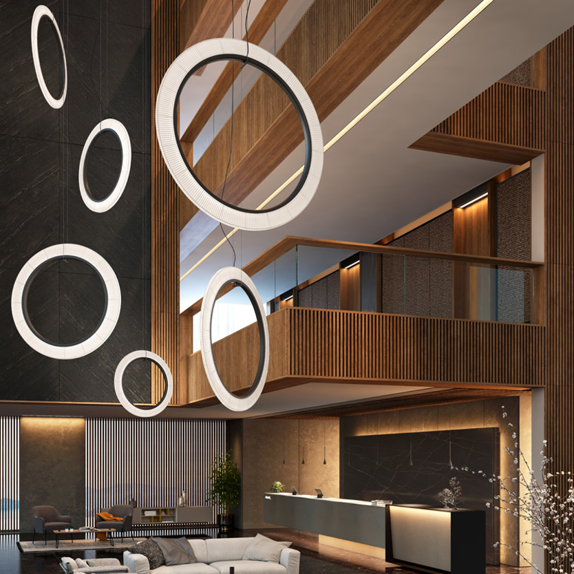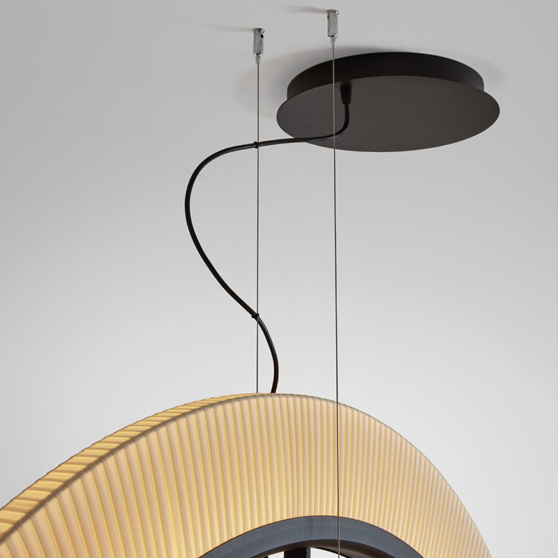 Product Code: 6B36604210190 Light source: 49W LED (Built-In) | 2700K | CRI 90 | 2160lm Materials: Aluminium, Steel, Ribbon Dimensions: Ø 1200mm x W 110mm | 2000mm Cable Suspension Brand: Bover The Roda Collection is characterized by its large, cylindrical, ring-shaped shade. Its inner contour is surrounded by an aluminum ring housing a continuous circle of LEDs, emitting a uniform, filtered light. The warmth of the ribbon is highlighted by the dark ring outlining the perimeter, making these fixtures particularly cozy and lightweight, because despite their large volume, they seem weightless. Rated IP20 suitable for indoor use. Dimmable 1-10V - other versions available on request (price varies). Designed by Joana Bover and made in Spain. For trade enquiries, please contact us below. |